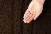 Ręka dziecka i nasionka dorosłego. Hodowla nasion warzyw na glebie nasiennej w metaforze ogrodniczej, koncepcja rolnictwa. Nasiona siewne na otwartym gruncie.
