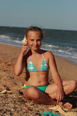 Letnie wakacje, urocza dziewczyna spoczywających na plaży w pobliżu wody morza