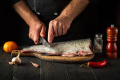 Szef kuchni przygotowuje srebrny karp w kuchni. Przygotowanie do wycinania ryb nożem. Środowisko pracy na stole kuchennym