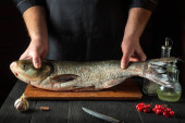 Zdjęcie "Szef kuchni przygotowuje srebrny karp w kuchni. Przygotowanie do wycinania ryb nożem. Środowisko pracy na stole kuchennym" może być wykorzystywane do celów osobistych i komercyjnych zgodnie z warunkami zakupionej licencji Royalty-free. Obraz jest dostępny do pobrania w jakości wysokiej rozdzielczości do 5760x3840.