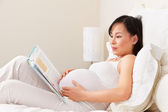 kobieta w ciąży czytając książkę na kanapie.