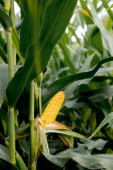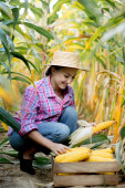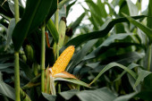 Rolnik trzymający kolby kukurydzy w ręku na polu kukurydzy.