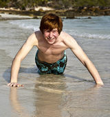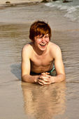 szczęśliwym chłopcem czerwony włosów jest korzystających z plaży