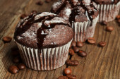 czekoladowe Muffiny z galaretką truskawkową na tle ziaren kawy