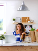 uśmiechnięta młoda kobieta z filiżanki kawy i laptopa w kuchni w domu