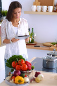 Portret uśmiechniętej kobiety SMS-owanie warzyw w kuchni w domu