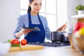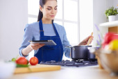 Zdjęcie "Portret uśmiechniętej kobiety SMS-owanie warzyw w kuchni w domu" może być wykorzystywane do celów osobistych i komercyjnych zgodnie z warunkami zakupionej licencji Royalty-free. Obraz jest dostępny do pobrania w jakości wysokiej rozdzielczości do 5760x3840.