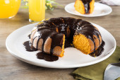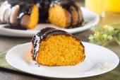 plasterek ciasta marchewkowego z polewą czekoladową.