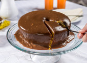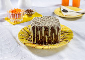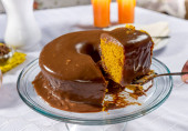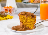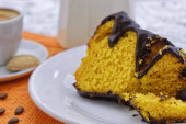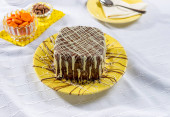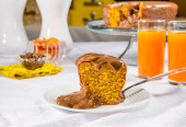 plasterek ciasta marchewkowego z polewą czekoladową.