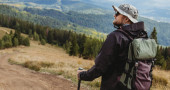 kobieta podróżnik w żółtej kurtce w kapeluszu plecak podróże góry Świeże powietrze