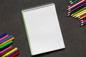 Notatnik i kolorowe kredki na arkuszach papieru teksturowane.