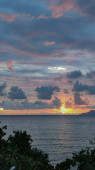 Zdjęcie "Na zdjęciu zachód słońca w górach na tle Oceanu Atlantyckiego. Słońce spada za górą i jest w chmurach. Woda oceaniczna odzwierciedla blask zachodzącego słońca." może być wykorzystywane do celów osobistych i komercyjnych zgodnie z warunkami zakupionej licencji Royalty-free. Obraz jest dostępny do pobrania w jakości wysokiej rozdzielczości do 5760x3840.