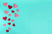 Walentynki pionowy sztandar. Białe i czerwone serca na pastelowym niebieskim tle, widok z góry, przestrzeń do kopiowania.
