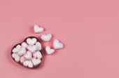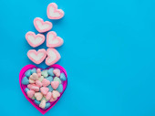 Walentynki w tle. Białe i czerwone serca na pastelowym niebieskim tle, widok z góry, przestrzeń do kopiowania. Koncepcja Walentynek.