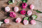 bukiet czerwonych tulipanów z małymi sercami na niebieskim tle, widok z góry