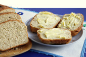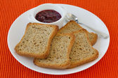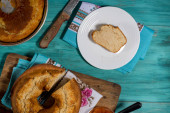 plasterek ciasta na białym talerzu z galaretką i ciastem, w tle na niebieskim tle.