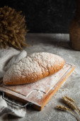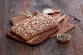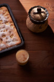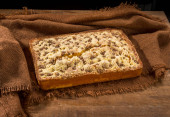 kwadratowe ciasto bananowe na rustykalnym brązowym materiale na drewnie.