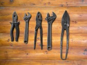 Brudny zestaw narzędzi ręcznych na drewnianych deskach.