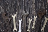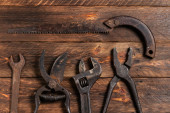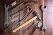 Brudny zestaw narzędzi ręcznych na drewnianych deskach.