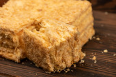 plasterek kwadratowego ciasta kukurydzianego na drewnie z ciastem kukurydzianym w tle.