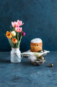 całe ciasto pomarańczowe na drewnie z pomarańczową skórką, kawałki pomarańczy w białym słoiku i ciasto w tle.