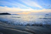 Na zdjęciu zachód słońca w górach na tle Oceanu Atlantyckiego. Słońce spada za górą i jest w chmurach. Woda oceaniczna odzwierciedla blask zachodzącego słońca.