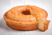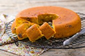 całe ciasto pomarańczowe na drewnie z pomarańczową skórką, kawałki pomarańczy w białym słoiku i ciasto w tle.