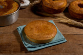 całe ciasto z mąki pszennej na tkaninie i wiejskim drewnie z proszkiem do pieczenia i ciastem w tle.