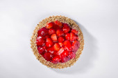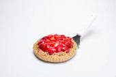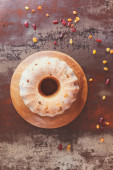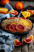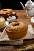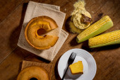 ciasto kukurydziane bez plasterka na wiejskim drewnie i tkaninie z kukurydzy, plasterek w talerzu i ciasto w tle.