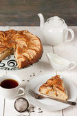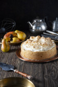 ciasto kukurydziane bez plasterka na wiejskim drewnie i tkaninie z kukurydzy, plasterek w talerzu i ciasto w tle.