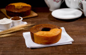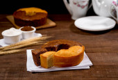 ciasto kukurydziane bez plasterka na wiejskim drewnie i tkaninie z kukurydzy, plasterek w talerzu i ciasto w tle.