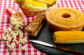 ciasto kukurydziane bez plasterka na wiejskim drewnie i tkaninie z kukurydzy, plasterek w talerzu i ciasto w tle.