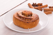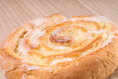 kawałek mąki pszennej na drewnie z gałązką pszenną obok.
