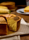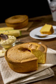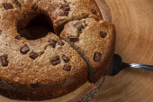 ciasto czekoladowe i mąka pszenna oraz plasterek na materiale na drewnie z ciastem w tle z gałązką pszenicy, biała płyta, biały bucik obok.