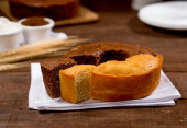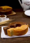ciasto czekoladowe i mąka pszenna na tkaninie na drewnie z ciastem w tle z gałązką pszenicy, biały talerz, biały bucik obok.