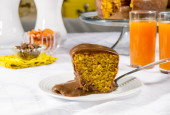 ciasto czekoladowe i mąka pszenna oraz plasterek na materiale na drewnie z ciastem w tle z gałązką pszenicy, biała płyta, biały bucik obok.