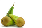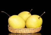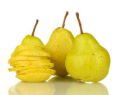 Cztery słodkie soczyste gruszki na drewnianym stole, makro, widok z góry.