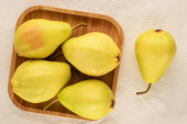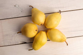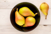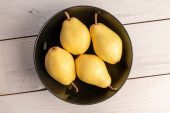 Trzy słodkie soczyste gruszki z czarnym daniem na drewnianym stole, makro, widok z góry.
