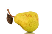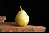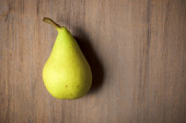Jedna słodka soczysta gruszka na drewnianym stole, makro, widok z góry.
