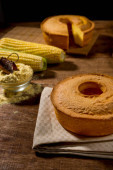 ciasto z mąki pszennej na drewnie z innym ciastem w tle z gałązką pszenicy obok.