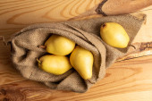 Dwie słodkie soczyste gruszki z workiem jutowym na drewnianym stole, makro, widok z góry.