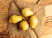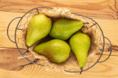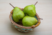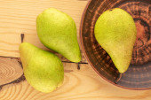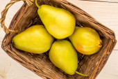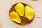 Trzy słodkie soczyste gruszki z koszem na drewnianym stole, makro, widok z góry.