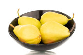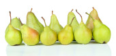 Trzy słodkie soczyste gruszki w szklanym naczyniu, makro, izolowane na białym tle.