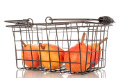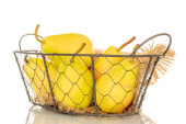 Cztery słodkie soczyste gruszki z koszem, makro, izolowane na białym tle.