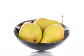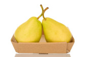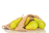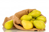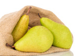 Dwie słodkie soczyste gruszki z workiem jutowym, makro, izolowane na białym tle.