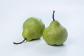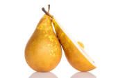 Dwie słodkie soczyste gruszki na tacce bambusowej, makro, odizolowane na białym tle.