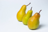 Dwie słodkie soczyste gruszki na drewnianej tacy, makro, odizolowane na białym tle.