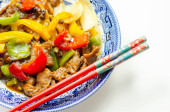 Gotowane plasterki wołowiny z pikantnym sosem z czarnej wołowiny, papryki i cebuli, chińskie jedzenie