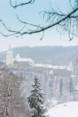 Zamek Kost. Widok na zamarznięty staw historycznie zamek Kost, Czechy.