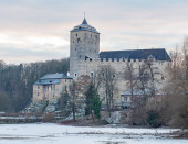 Panorama Hrad Kost. Zamek Kost w zimowym krajobrazie, widok na zamarznięty staw Bily. Podróże w Czechach